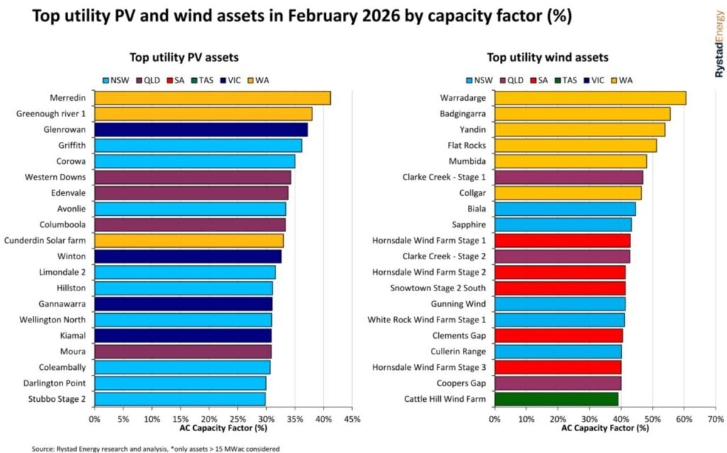 Western Australia claimed all three top positions for wind asset performance in February, with Potentia Energy and Synergy’s Warradarge Wind Farm leading the field at 60.5% capacity factor. APA Group’s Badgingarra Wind Farm followed with 55.6% capacity factor, while Alinta Energy and RATCH-Australia’s Yandin Wind Farm rounded out the top three at 53.9% capacity factor.