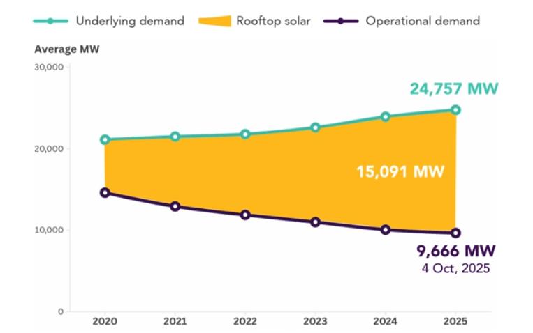 Australia’s National Electricity Market (NEM) achieved a new minimum operational demand record of 9,666MW on 4 October, marking a 4% decrease from the previous record set during Spring 2024.