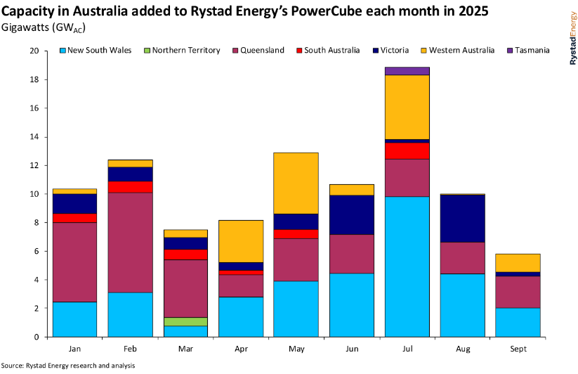 Australia’s renewable energy sector recorded its slowest month of the year for additions in September, with 5.8GW of new projects added to development pipelines, according to data from Rystad Energy.