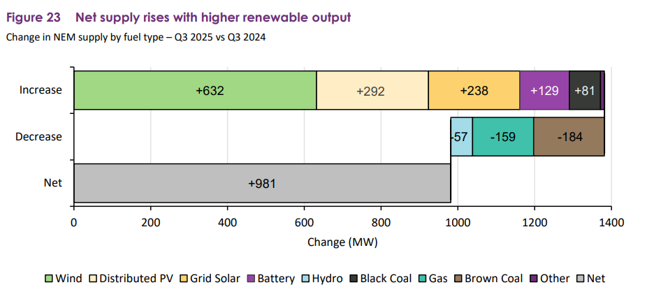 Volume-weighted average prices across NEM regions ranged from AU$80/MWh in Queensland to AU$124/MWh in South Australia, representing reductions of 22% to 38% compared to Q3 2024.