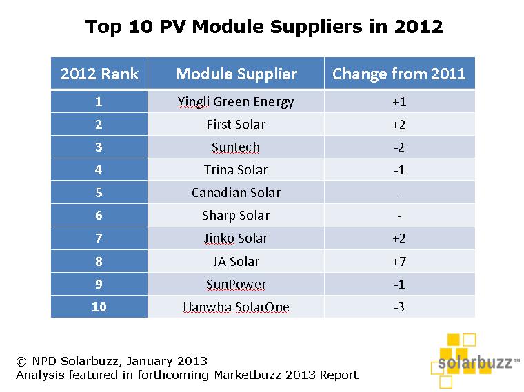According to the latest research findings from NPD Solarbuzz (based upon new channel checks and confirmations), Yingli Green Energy can be confirmed as the number 1 PV module supplier during 2012.