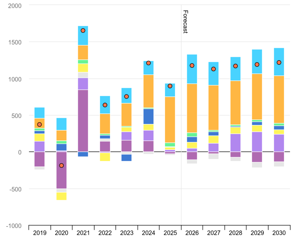 That thirst will be quenched by renewable energy and nuclear power, the IEA’s recent report said, which will generate 50% of global electricity by 2030, an 8% increase on the proportion today. Renewable output will grow by around 1,000TWh annually, led overwhelmingly by an expansion in solar PV deployments, which will add around 600TWh a year. The IEA’s forecast said that PV additions will expand in 2026 and then contract slightly for the following four years, though still adding over 600TWh of new capacity annually. The next highest power additions come from wind power, natural gas and nuclear energy.