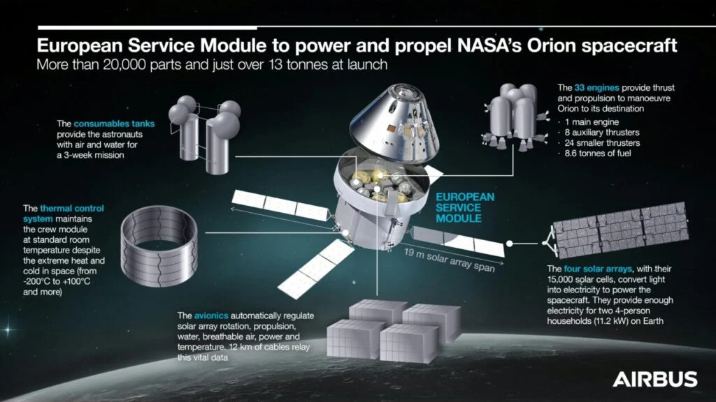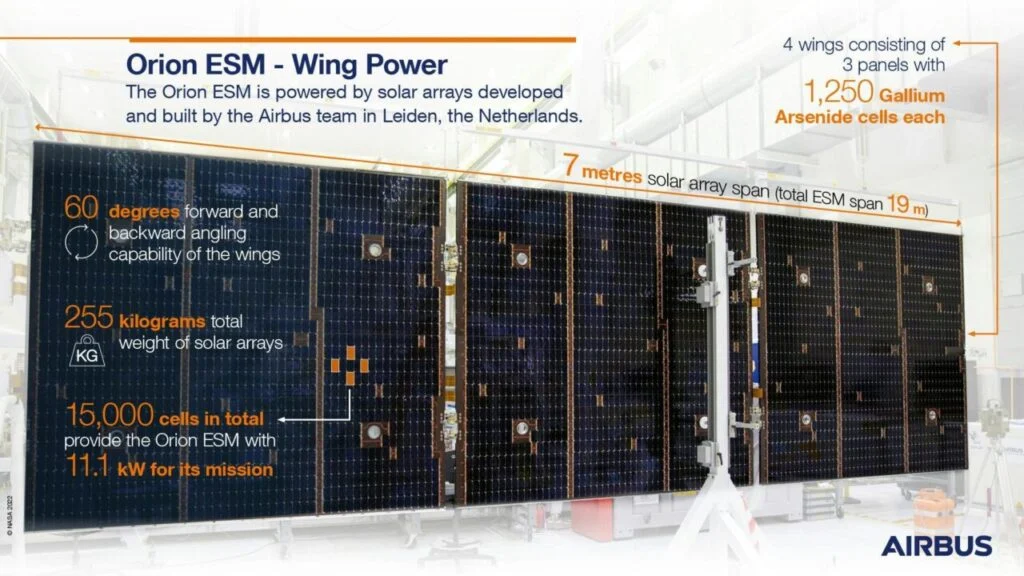 The array features four seven-metre-long solar wings attached to the European Space Module (ESM) built by Airbus for the European Space Agency (ESA). Airbus described the ESM as the “powerhouse” of the spacecraft, providing the propulsion, power, thermal control and the air and water needed for the crew.