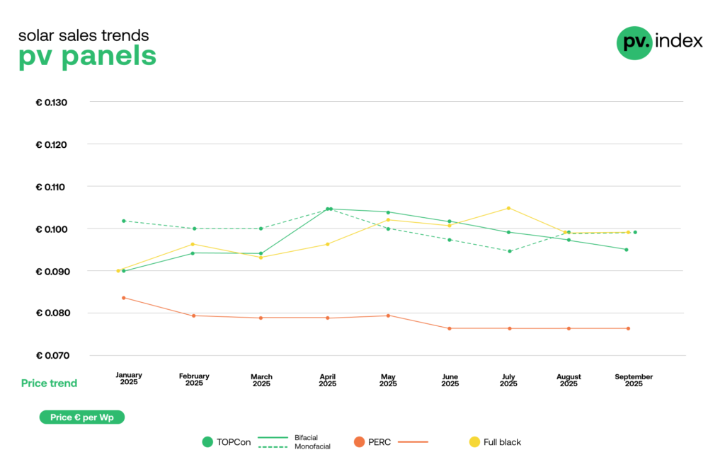 The latest pv.index report from online solar marketplace sun.store shows that prices for passivated emitter rear contact (PERC), monofacial tunnel oxide passivated contact (TOPCon) and full black modules all remained steady in September 2025. The report said that the stability reflected “balanced supply and stable demand” of TOPCon modules and the attraction of cheaper PERC panels for “cost-driven projects”.