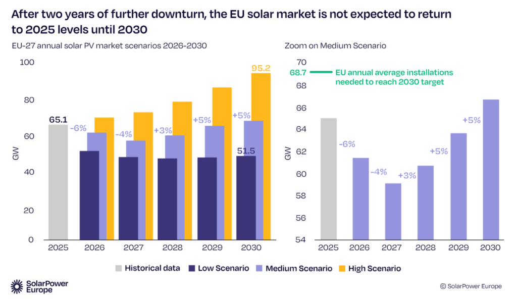 Solar installations are expected to continue to decline for another two years before single-digit increases return in 2027. 2025 deployment levels will not be reached again until 2030, according to SolarPower Europe’s medium forecast scenario.