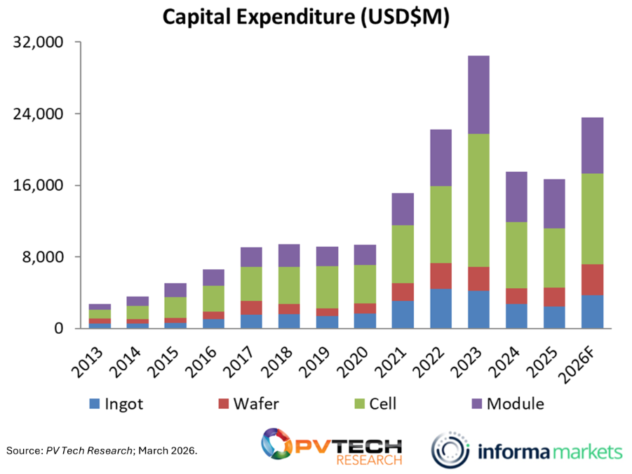 However, the tide is turning, and a global capex rebound is now expected. After reaching over US$36 billion in 2023, total capex fell to US$22.45 billion in 2024 and then again to US$21.2 billion in 2025. But this year, our data forecasts that capex spending will rise to US$29 billion. Cell capex will increase notably, rising from US$6.4 billion in 2025 to US$9.9 billion in 2026. The figures are revealed in the Q1 edition of PV Tech Research’s ‘‘PV manufacturing and technology quarterly’ report.