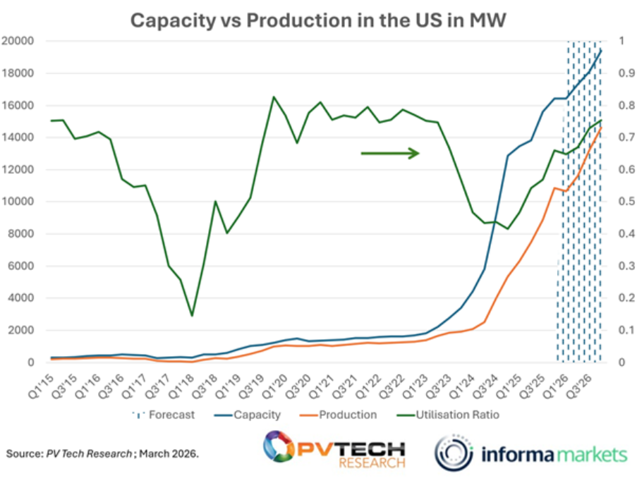 The demand for domestically manufactured PV modules is clearly reflected in utilisation rates across the US manufacturing landscape. Utilisation rates across US manufacturing facilities are approaching 80%, which is considered full capacity. This strong demand is expected to absorb any future capacity additions in the short to medium term.