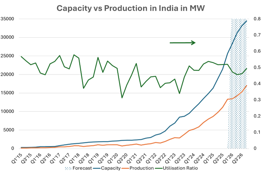Despite these positive trends, questions remain about the sustainability of India’s capacity expansion. Utilisation rates have generally ranged between 50% and 60%, indicating steady use of added capacity. However, the decline in utilisation rates before 2023 – when the industry was booming – raises concerns about the sustainability of this growth. Bridging the gap between module and cell capacity will be a key determinant of India’s capex outlook. By the end of 2025, module capacity stood at just over 82GW, while cell capacity was at just under 30GW, highlighting the need for further investment in upstream segments.
