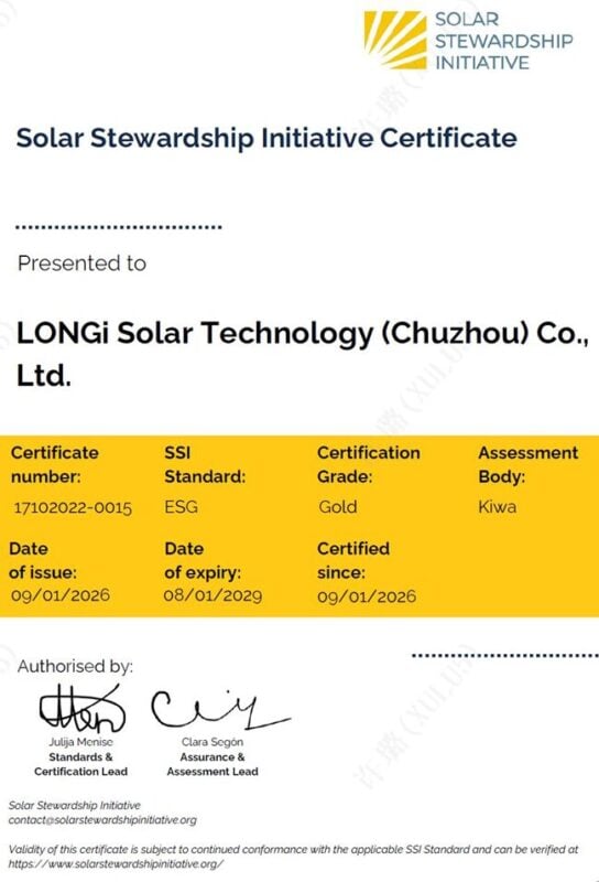 LONGi VP Dennis She commented: “Obtaining SSI-ESG gold certification represents international recognition of our sustainable development practices and demonstrates our commitment to the core values of our European customers—namely, delivering trusted green products. We will continue to drive progress through technological innovation, providing European customers with high-efficiency, low-carbon-footprint photovoltaic solutions. This will help reduce the costs of the energy transition, enhance energy independence and jointly accelerate the carbon neutrality process, working together toward a sustainable future.”