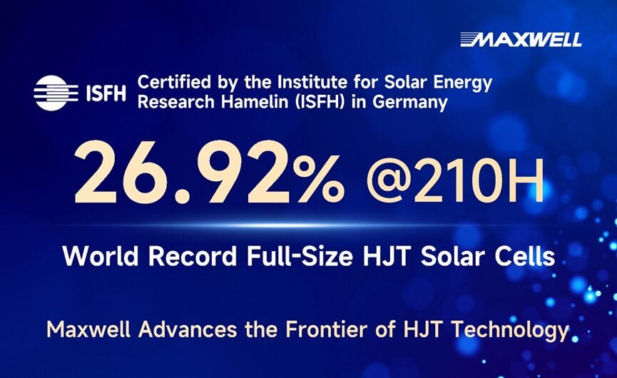 Maxwell Technologies has announced that its independently developed HJT solar cells have achieved a conversion efficiency of 26.92% on a full size 210 half-cut wafer (220.76 cm²). This milestone, officially certified by Germany’s Institute for Solar Energy Research (ISFH), sets a new world record for HJT solar cells, marking a new era for the company in the R&D and industrialization of the high-efficiency technology.