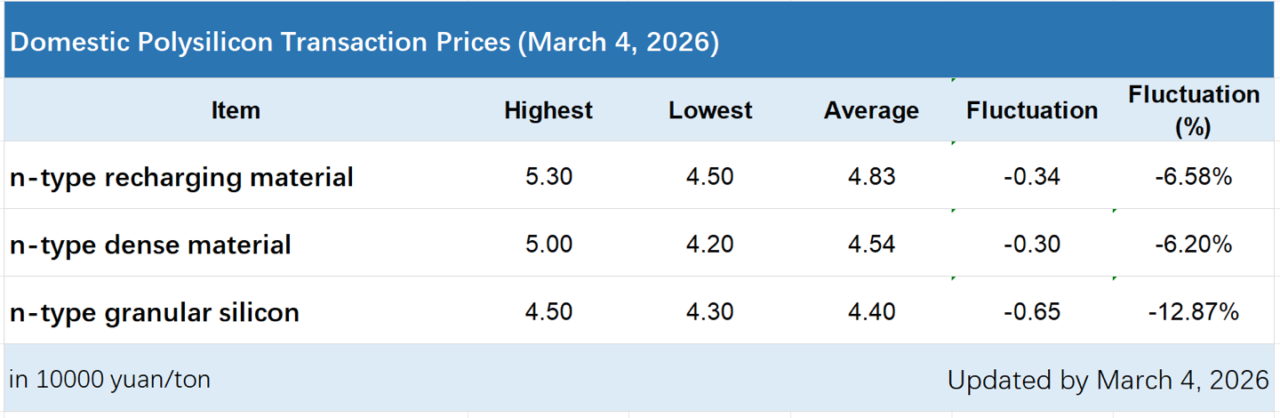 The latest domestic solar-grade polysilicon transaction prices from the Silicon Industry Branch of the China Nonferrous Metals Industry Association show that all domestic n-type solar-grade polysilicon products have plunged, with steep declines across the board.