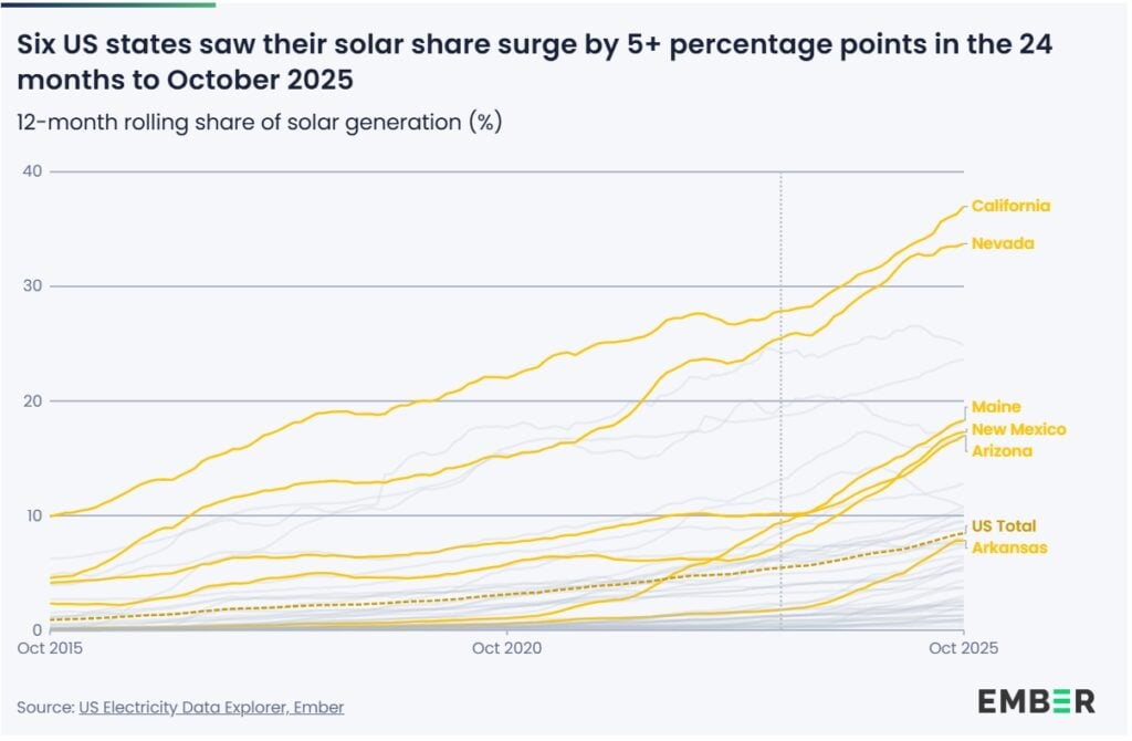 California remains the leading state in terms of the highest solar share with 37%, followed by Nevada with 34%. Both states, along with Arkansas, Arizona, Maine and New Mexico, have seen their solar share rise by more than five percentage points in the 24 months to October 2025. New Mexico has had the fastest increase, rising ten percentage points from 7% to 17% during that period.