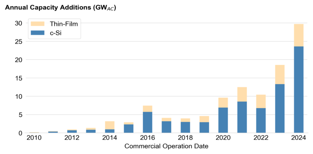 By contrast, thin-film deployments remained fairly constant, rising by under 1GW from 5.24GW in 2023 to 6.13GW in 2024. This is likely because the US only has one major thin-film module producer, First Solar.